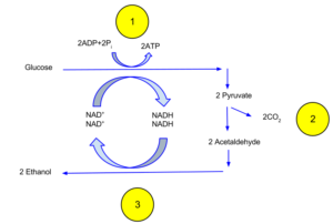 Another familiar fermentation process is alcohol fermentation (Figure 9.16) that produces ethanol, an alcohol. The first chemical reaction of alcohol fermentation is the following (CO2 does not participate in the second reaction). The first reaction is catalyzed by pyruvate decarboxylase, a cytoplasmic enzyme, with a coenzyme of thiamine pyrophosphate (TPP, derived from vitamin B1 and also called thiamine). A carboxyl group is removed from pyruvic acid, releasing carbon dioxide as a gas. The loss of carbon dioxide reduces the size of the molecule by one carbon, making acetaldehyde. The second reaction is catalyzed by alcohol dehydrogenase to oxidize NADH to NAD+ and reduce acetaldehyde to ethanol. The fermentation of pyruvic acid by yeast produces the ethanol found in alcoholic beverages. Ethanol tolerance of yeast is variable, ranging from about 5 percent to 21 percent, depending on the yeast strain and environmental conditions.